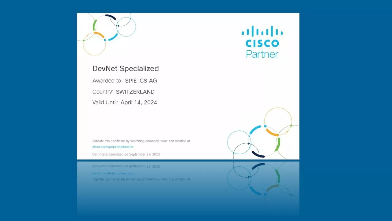 La spécialisation Cisco DevNet est reconnue dans le monde entier. Grâce à celle-ci, SPIE Suisse démontre non seulement ses compétences, mais se démarque également en tant qu’acteur majeur dans le domaine des technologies réseau. Elle vient souligner l'expertise de l'équipe au service des plateformes Cisco, mettant l'accent sur ses connaissances en matière d'automatisation de réseau, de développement d'applications et de gestion d’infrastructures.